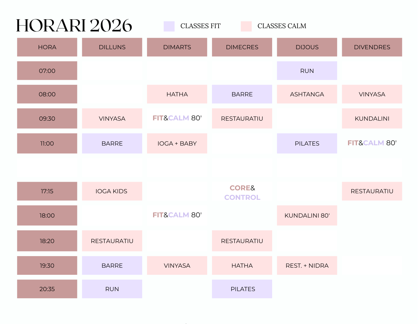 Incluyen Barre, Core & Control (Pilates), RUN y FIT & CALM.